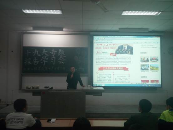 青春喜迎十九大,同心共筑中国梦。为贯彻学习十九大会议精神,增强支部成员政治意识,思想高度同以习近平同志为核心的党中央保持一致,4556银河国际第七学生党支部于2017年10月18日在教1-104召开“十九大”精神专题学习报告会,支部成员共计21人参加,会议由支部书记刘昊雨主持。