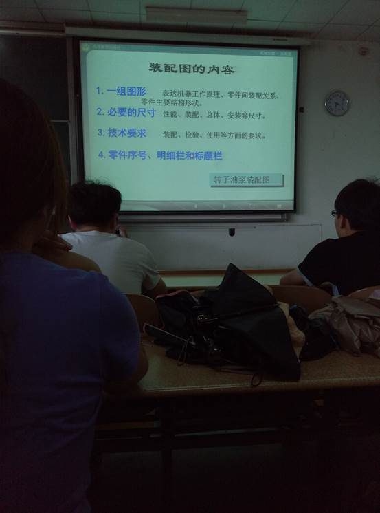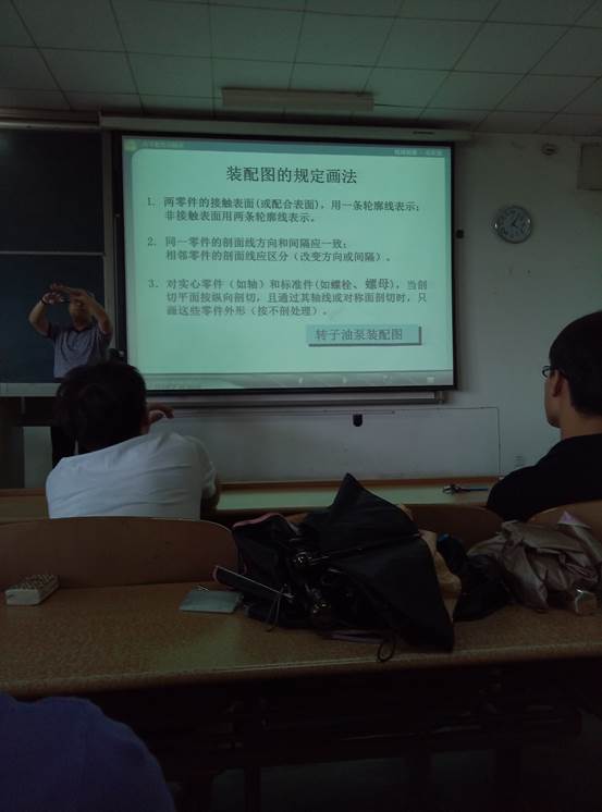 讲座一开始,高教授首先向同学们讲解了规范使用AutoCAD制图的重要性。随后高教授运用自己制作的PPT,采用一边讲解规范要求一边举例的方式向同学们详细讲解了装配图的规定画法、技术要求、所需表达的内容和装配图的七种特殊表示方法。紧接着,高教授拿出自己所带学生的图纸并结合历届毕业图纸中存在的问题与经验,就AutoCAD制图格式规范方面容易出现的问题进行了例举,并现场传授同学们设置标注字体的方法。