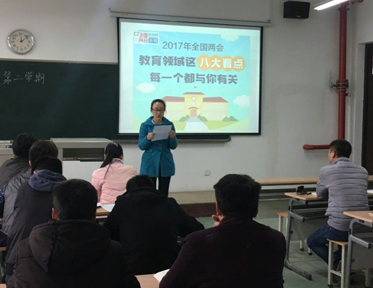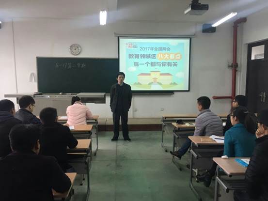 最后由张晖老师带领大家一同学习了两会期间与教育领域相关的提议,其中包括教育信息化,教育扶贫,民办教育,校园安全,随迁子女就学,减轻学生课业负担,高考改革,校园贷现象的政策等。张晖老师要求各位党员要经常关注国家时政要闻,要以优秀党员的标准要求自己,感染其他同学,使研究生的管理上升到一个新的平台。