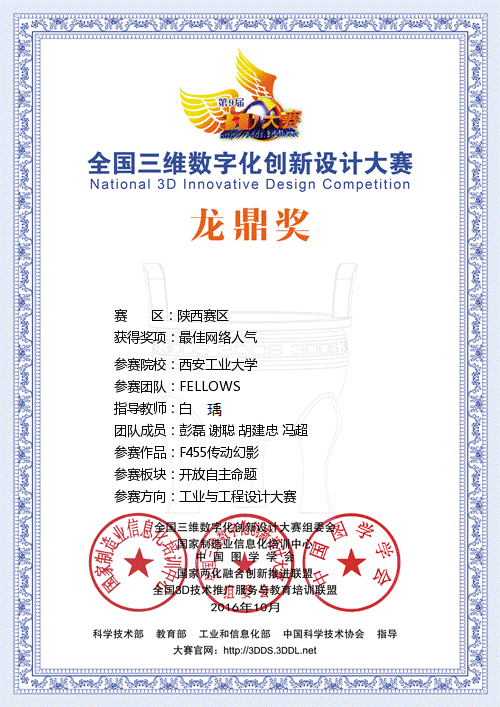 近日,我校在第九届全国三维数字化创新设计大赛(3D大赛)省赛中喜获多项佳绩,共取得最佳网络人气奖1项,陕西赛区特等奖2项,一等奖1项,三等奖3项的优异成绩。
