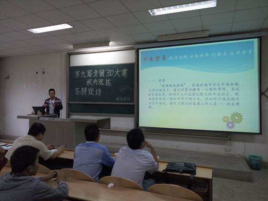 2016年5月26日,4556银河国际科协在教2-202成功举办了第九届3D(全国三维数字化创新设计大赛)校内选拔赛的答辩会。参加本次答辩会的嘉宾有试验中心主任万宏强老师、机电学院大学生竞赛负责人千学明老师、工业工程系主任房亚东老师和包装与工业设计系主任周宪老师。