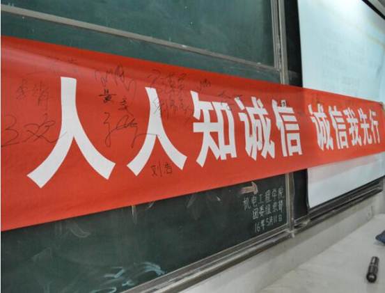 2016年5月11日,为了使我院学生”知懂诚信,践行诚信”,学院在教2-504举行了“人人知诚信,诚信我先行” 大型签名活动。出席活动的嘉宾有14级导员黄彦军老师、团委副书记胡俊杰、秘书长张晨及各年级学生代表。