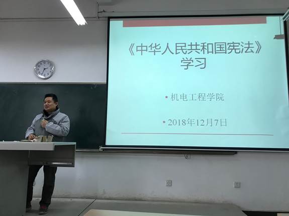 活动前,机电工程学院书记赵玉厚老师要求机电学院全体教师从实际出发,不仅要学习宪法内容,还要深入精髓,学习宪法精神:即坚持社会主义本质特征的精神;坚持民族团结和国家统一的精神;坚持改革开放的精神;坚持实事求是,从实际出发的精神。还要通过此次活动,引导同学们用宪法规范自己的行为,深入学习、宣传宪法,全面深刻理解宪法的基本原则和精神,充分认识社会主义制度的优越性,增强宪法意识、公民意识、爱国意识和民主法治意识,大力弘扬法治精神。不仅自己遵纪守法,还要把法制意识宣传给周围的人,真正做到宪法在我们的一言一行之中,宪法更在我们的心中。