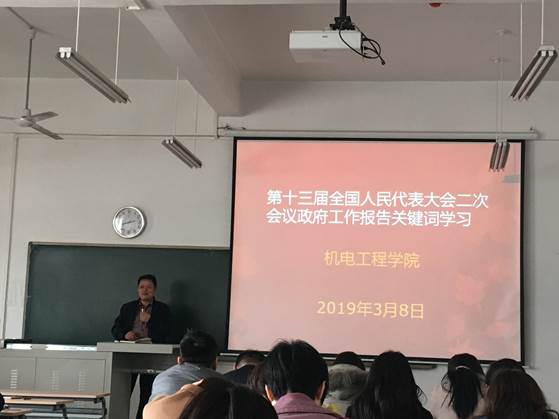 赵玉厚老师首先向大家介绍了2019年政府工作报告的主要内容,并对其中出现的高频关键词做了详细的介绍。赵老师结合我院具体情况,对“科技支撑能力”、“打造工业互联网平台”等关键词做了重点解读。最后,赵老师鼓励全体教师充分利用“学习强国”APP了解国家政策、国际国内大事以及治国理政新思想,贯彻落实政府工作报告,加强理论知识的学习,共同助力学院发展。
