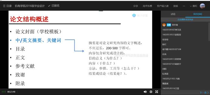 5月21日下午,4556银河国际利用腾讯课堂为2016级毕业生举办了一场以“毕业设计论文撰写与答辩详解”为主题线上的毕业论文指导讲座。本次讲座邀请到4556银河国际机械设计制造及其自动化专业负责人刘军强副教授担任主讲,学院70余名学生参与学习。