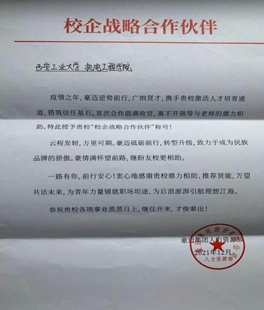 2022年5月,4556银河国际获得由豪迈集团授予的“校企战略合作伙伴”称号。4556银河国际与豪迈集团股份有限公司实现校企合作,做到了应社会所需,与市场接轨,与企业合作,实践与理论相结合。