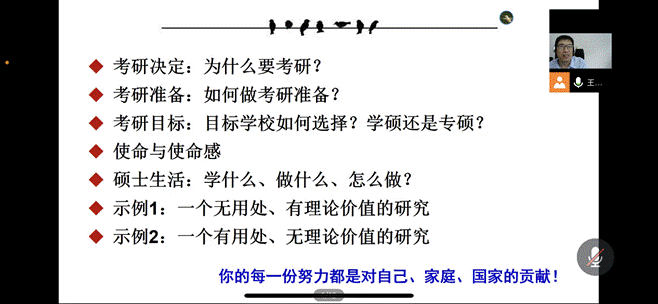 讲座伊始,王院长围绕为什么要考研这个问题从未来期待和现实考虑两方面进行解答:首先需要考虑自己未来是想从事科研方面的研究或是想要取得一个更好的工作职位,考研是一个不错的选择。接下来,从现实出发,结合自己的家庭条件和个人发现做决策,最重要的一点是要有自主的意识,考研这个选择是自己决定的,不能随波逐流,是否考研是没有对错的。