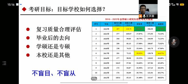 接着,王院长以考研准备和考研目标为主题,帮助同学们清晰认知考研形式及考研的难度。在学校,城市的选择方面也给出了中肯的意见:综合复习质量,毕业后的去向合理选择。