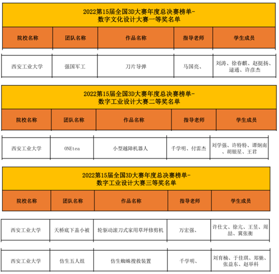 我校进入决赛的4支参赛队伍经过前期精心准备,对作品的反复打磨,在竞赛过程中充分展示了各自作品的创新点、技术难点及应用价值,从容应对评委和专家的在线提问。在全国总决赛中,机电学院马国亮老师指导的《刀片导弹》团队获1等奖;机电学院千学明、付雷杰老师指导的《小型越障机器人》团队获2等奖;机电学院万宏强老师指导的《轮驱动滚刀式家用草坪修剪机》团队、千学明老师指导的《仿生蜘蛛搜救装置》团队分获3等奖,充分展现了西安工大学子积极拼搏,勇于进取的探索精神。